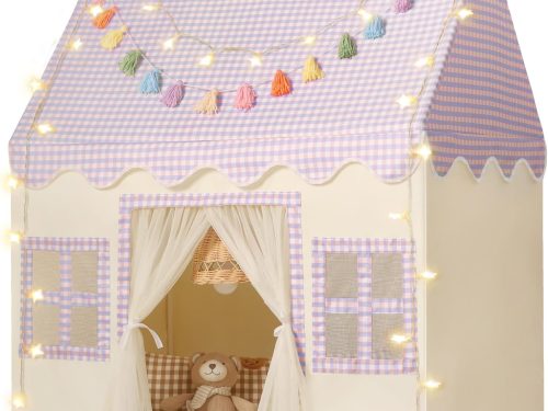 Kids Play Tent Indoor: Mat, Tassel Garland, Star Lights - Purple Checkered Girls Tent Playhouse for Toddlers Kids Toys for Boy Girl Birthday Gift