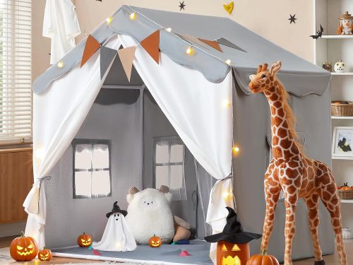 Kids Tent, Kids Play Tent 2 in 1 with Padded Mat and Lights, Large Playhouse with 2 Doors & 4 Windows, Indoor & Outdoor, Halloween Toddler Playhouse, 51" x35" x 51" (Gray)