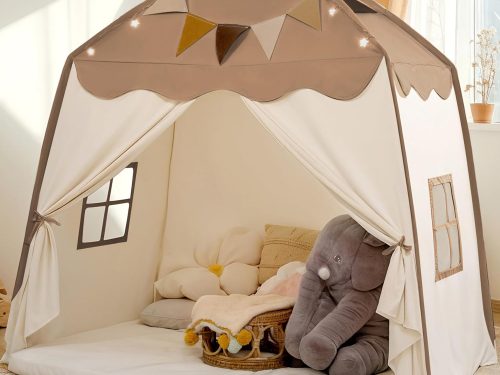 Extra Large Kids Play Tent with Flags & Star Lights, Portable & Foldable Teepee, Bed Tents Bed Canopy for Boys & Girls, Indoor Outdoor Dome Tent Playhouse,Kids Birthday Gift, 59x39x59in, Brown