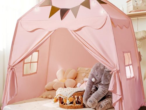 Extra Large Toddler Bed Tent & Kids Play Tent Bed Tent with Flags & Star Lights, Portable & Foldable Teepee, Indoor Outdoor Dome Tent Playhouse, 59x39x59 in,Pink